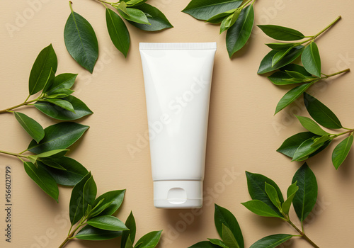 Cosmetic Tube in Green Leaves Natural Flat Lay