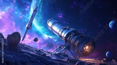 space, telescope, rocket, planet, star, galaxy, cosmos, astronomy, exploration, universe, science, technology, future, fantasy, science fiction, artwork, digital, painting, illustration, cosmic, nebula, night, dark, mystery, wonder, discovery, alien, extraterrestrial, celestial, lunar, satellite, travel, adventure, mission, research, observation, powerful, distant, bright
