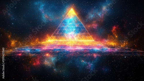 pyramid, nebula, cosmos, space, galaxy, star, astronomy, cosmic, celestial, universe, artwork, abstract, fantasy, futuristic, glowing, light, energy, vibrant, colours, orange, blue, red, yellow, purple, night, dark, mystery, wonder, imagination, creation, structure, geometric, design, pattern, line, triangle, grid, three-dimensional, illustration