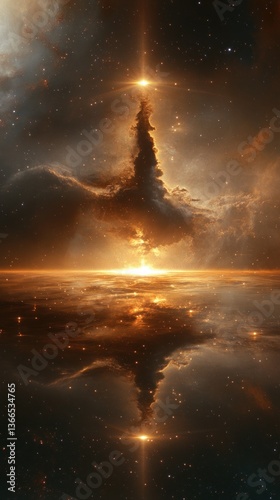 sunrise, cosmos, alien, mirrored, ocean, nebula, space, star, galaxy, universe, planet, celestial, light, gold, sky, cloud, astronomy, spacecraft, exploration, fantasy, science, fiction, beautiful, amazing, stunning, digital, art, graphic, design, texture, colours, orange, yellow, brown, dark, bright, morning, evening, abstract, symmetry, horizon, landscape, nature, imagination, glowing, cosmic