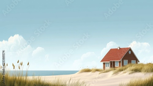 Cottage by the Sand Dunes Near the Sea with Clear Blue Sky and Empty Copy Space for Text or Branding