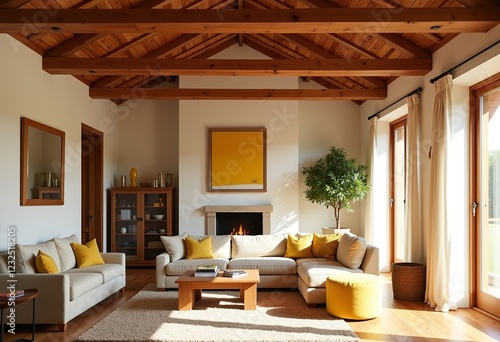 Country Cottage Open Plan Lounge, Timber Slatted Roof, Large Windows, Sheer Curtains, Morning Light, Yellow Beige Accents, Simplistic Design, Oak Framed Art, 100x130cm.