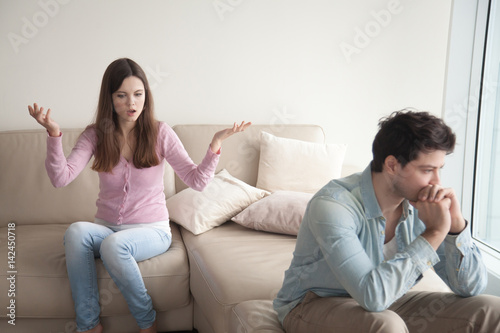 Couple arguing. Young woman speaking emotionally, blaming man, gesturing, explaining opinion. Unhappy girlfriend shouting to frustrated boyfriend, guy sitting back not talking to her. Family quarrel