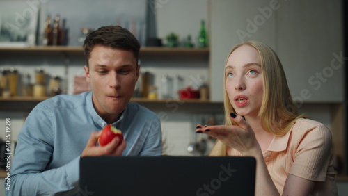 Couple enjoying virtual meeting by laptop at kitchen closeup. Pair communicating