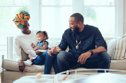 man, woman, adult, mid, girl, baby, african american, modern, to sit, smile, enjoy, father, mother, daughter, family, together, living room, sofa, pillow, window, sunlight, diversity, indoor, day, people, three, group, togetherness, casual attire, attire, short hair