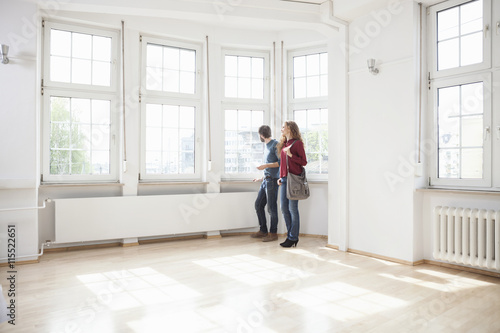 Couple looking around in empty apartment