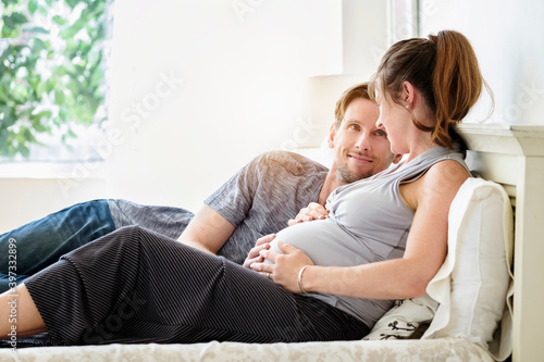 horizontal, indoor, day, selective focus, lying down, two people, couple, pregnant, new life, domestic life, home interior, bedchamber, bed, care, content, love, loving, togetherness, anticipation, face to face, family, hand, caring