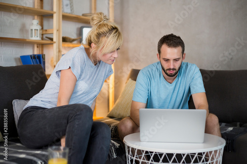 Couple sitting on sofa in modern living room. They are having fun, watching laptop.