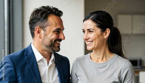 couple, smiling, man, woman, indoor, modern, human relationships, happiness, love, joy, connection, together, friends, people, sincerity, romance, lifestyle, casual attire, cheerful, conversation, adult, male, female, portrait, young, teamwork, collaboration, positive, friendly, emotion, interaction, home, cosy, engagement, eye, satisfaction, intimacy, support, oneness, trust, personality, attractive, charming, warmth, intimate, affection, partner, enjoyment