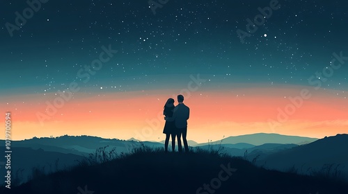 couple stands on a hilltop, wrapped in each other's arms, with a vast landscape stretching behind them under a starlit sky