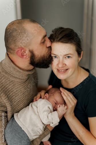 couple with a newborn baby. The father is kissing the mother's forehead while she holds the sleeping baby close. The scene conveys warmth and family love.