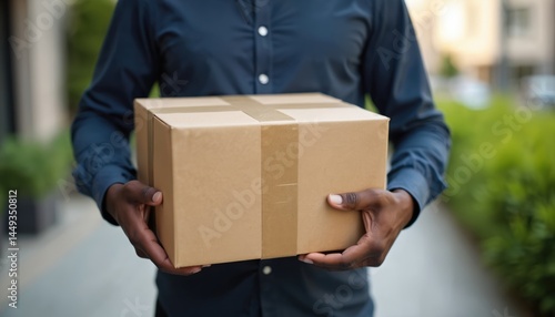 Courier holding parcel carton box, close-up. Man in dark shirt delivering package to client. Home delivery, online shopping, e-commerce, post service. Modern logistics, express shipping concept.