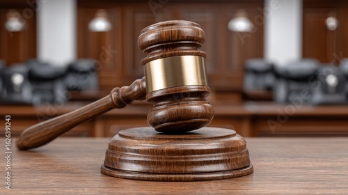 Courtroom justice close-up of gavel and scales emphasizing law and order in elegant judicial architecture