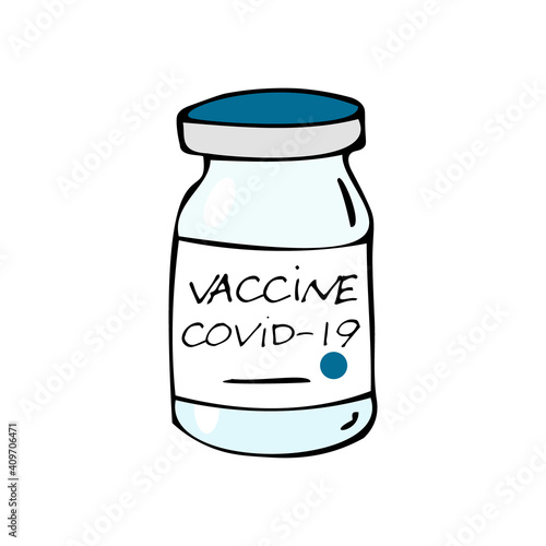 Covid-19 corona virusvaccination with vaccine bottle. Doodle vector illustration, simple cartoon line art.
