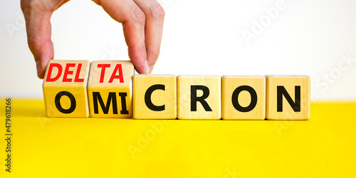 Covid-19 omicron or deltacron symbol. Doctor turns cubes and changes the word omicron to deltacron. Beautiful white background. Medical, covid-19 corona omicron or deltacron concept. Copy space.