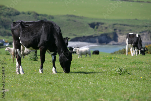 wales, field, green, summer, spring, sunny, bright, cow, cow, cattle, standing, looking, hill, britain, dairy, black, white, and, countryside, rural, coast, coastal, farm, farmyard, pet, farm animal, herd, sheep, beach, sea, eating