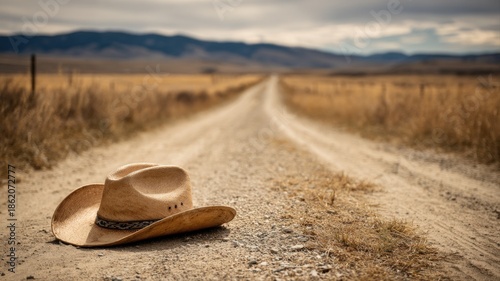 Cowboy hat lies on dirt road in rural landscape, evoking western themes and travel