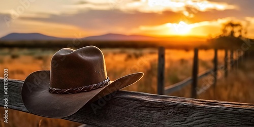 cowboy, hat, wooden, fence, sunset, field, rural, horizon, shadow, texture, leather, western, countryside, agriculture, barn, grass, sky, cloud, warm, gold, nostalgic, vintage, isolated, stillness, ranch, frontier, adventure, tradition, weather, patina, rustic, desert, open, space, lonely, heritage, landscape, dusk, ambience