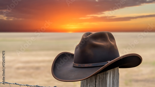 Cowboy hat resting on a wooden fence post against a sunset in a vast open field