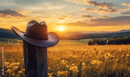 cowboy hat, hat, field, meadow, sunset, golden hour, nature, rustic, post, grass, wildflower, rural, countryside, peaceful, tranquil, warm light, scenic, landscape, farm, farmland, agriculture, open space, wilderness, summer, autumn, vacation, relaxation, travel, outdoors, hill