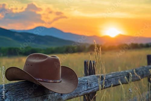 sunset, meadow, cowboy hat, fence, mountain, countryside, landscape, rural, golden hour, nature, western, field, pasture, country, horizon, sun, twilight, sky, brown, rustic, wooden, wood, grain, hay, grass, wildflower, wheat, quiet, peaceful, tranquil, freedom, leisure, beauty, travel, vacation, photo, image, scenic, view, amazing, stunning, beautiful, summer, fall