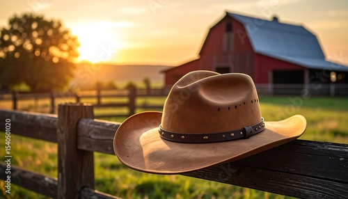 cowboy hat, sunset, farm, barn, rural, countryside, landscape, agriculture, western, ranch, field, fence, golden hour, nature, outdoors, summer, twilight, rustic, country life
