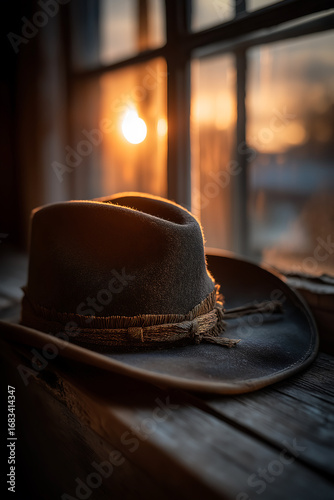 hat, cowboy, western, vintage, fashion, accessory, rustic, style, still, life, window, sunset, wood, table, light, shadow, brown, dark, sun, glow, texture, detail, worn, aged, country, rural, outdoors, warm, gold, evening, silhouette, interior, home, decor, classic, retro, close, up, art, design