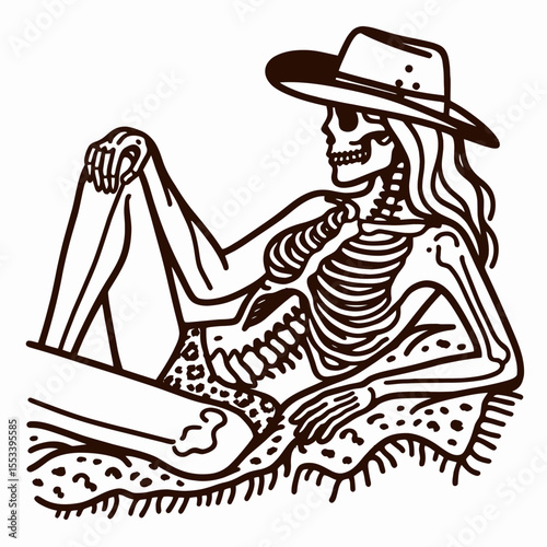 Cowgirl Female skeleton with leopard print Laying on a Blanket. Cowboy Western American Cartoon Animal Clipart Line Art Vector Illustration. .