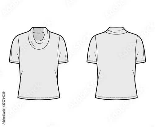 Cowl turtleneck jersey sweater technical fashion illustration with short sleeves, oversized body. Flat outwear apparel template front, back grey color. Women, men unisex shirt top CAD mockup