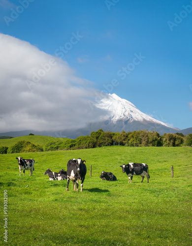Cows grazing on the green meadow with Mt Taranaki in the background, New Plymouth. Vertical format.