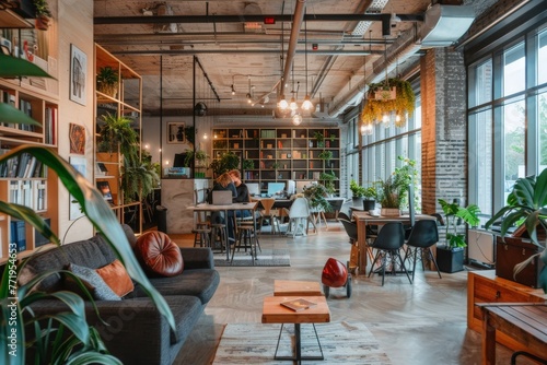 cosy, plant, bookshelf, rustic, office, workspace, communal, comfortable, interior design, greenery, collaboration, creative, stylish, eclectic, lounge, productivity, casual attire, design, trendy, urban, open space, innovative, networking, business, startup, library, contemporary, environmentally friendly, relaxing, professional, community, comfort