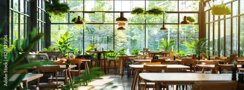 cozy and inviting restaurant interior with wooden tables, chairs, and leather sofas arranged in an open space