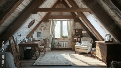 attic, room, wooden, beam, interior, design, home, cosy, comfortable, vintage, rustic, furniture, window, sunlight, daylight, chair, desk, book, shelf, rug, floor, wall, stone, brick, lamp, plant, decor, picture, frame, house, living, space, cabin, bungalow, country, style, warm, natural, light, modern, classic, traditional, photo, photo, art