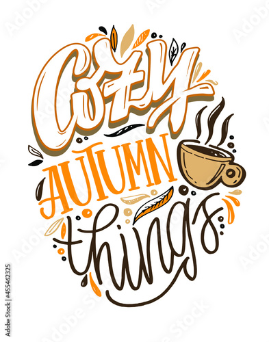 Cozy autumn things - Autumn is here - autumn vibes. Cute hand drawn doodle lettering label. Lettering for poster, web, t-shirt design.