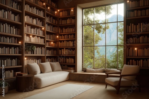 Cozy bookstore interior with warm lighting. Full bookshelves line walls. Comfortable seating area with sofa, armchair by large window with mountain view. Peaceful, inviting atmosphere. Perfect for