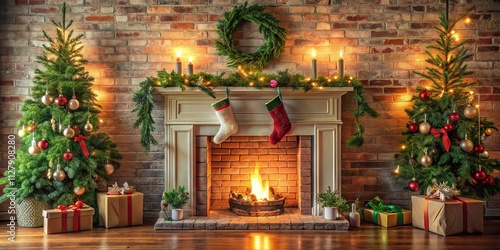 christmas, fireplace, tree, ornament, gift, present, decoration, holiday, winter, festive, cosy, warm, candle, stocking, mantle, brick, fire, warmth, celebration, season, joy, home, interior