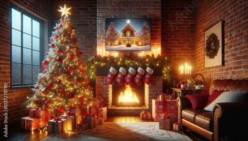 christmas, fireplace, stocking, present, tree, ornament, light, festive, holiday, candle, cosy, winter, warmth, gift, star, garland, decorated, celebration, home, chaplet, red, green, indoor, glow, snow, window, rug, joy, family, cheerful, wrapping, pine, holiday spirit, tradition, comfort, brick wall, illuminated, curtain, snowflake, candlelight, ribbon, surprise, holiday season