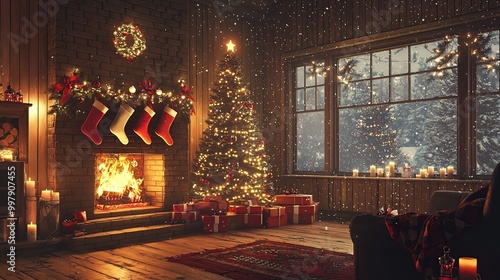 Cozy Christmas living room with fireplace, decorated tree, gifts, and snow falling outside the window.