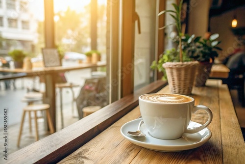 Cozy Coffee Cup on Wooden Table in Bright Sunlit Cafe Setting