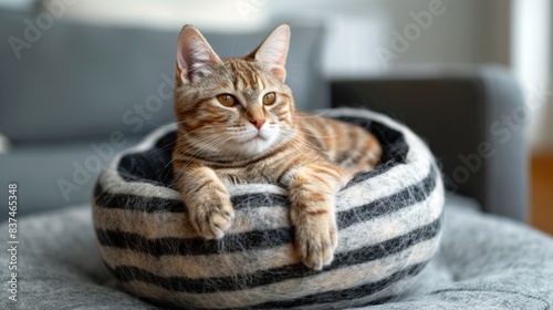 Cozy Comfort: Tabby Cat in a Felt Bed. A cozy scene of a tabby cat lounging in a stylish grey and white felt bed, epitomizing comfort and relaxation.