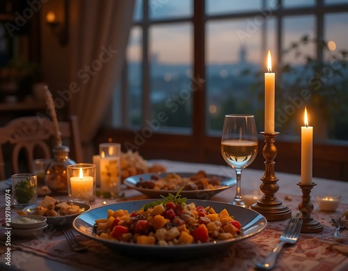 dinner, meal, food, candle, lighting, setting, wine, glasses, plate, serving, cutlery, fork, indoor, table, eatery, window, city, view, evening, dusk, romantic, cosy, warm, light, tableware, luxury, lifestyle, celebration, date, night, candlelight, pasta, dish, salad, racked, dining, residential, dinnerware