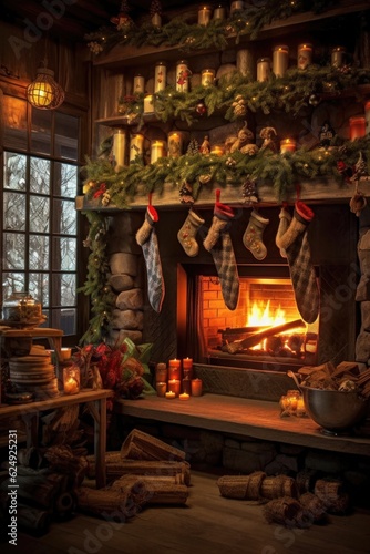 fireplace, cosy, stocking, garland, holiday, christmas, decoration, warmth, family, home, hearth, festive, generative, ai, traditional, red, green