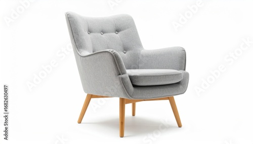 Cozy grey armchair with button detailing & wooden legs sits against a pristine white backdrop, offering a modern, minimalist furniture concept