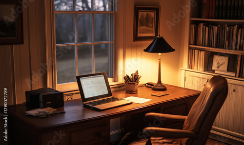 cosy, home, office, wooden, desk, leather, chair, inviting, decor, productive, work, comfortable, warm, stylish, elegant, functional, modern, personal, organised, inspiring, creative, classic, refined, quaint, charming