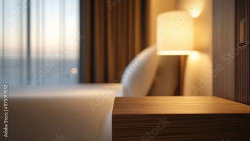 Cozy Hotel Room Top-Down View of Bedside Wooden surface Table. Blurred background for Product Display