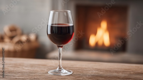 Cozy Indoor Scene with Glass of Red Wine Placed Near a Warm Fireplace for a Relaxing Atmosphere
