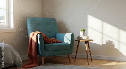 Cozy interior scene with armchair, blanket, and sunlit side table rendering, perfect for home decor inspiration