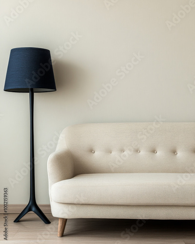 Cozy interior setup featuring a beige sofa and a stylish black floor lamp against a light wall in a modern living space