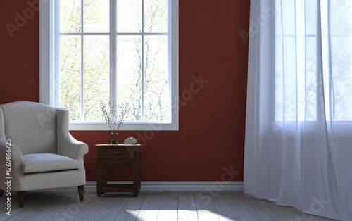 cosy, interior, natural, light, red, wall, armchair, window, small, table, wooden, floor, bright, serene, decor, home, daytime, furniture, living, space, simple, comfort, style, relaxation, modern, warm, design, aesthetic, colours, peaceful, ambience, calmness, element, curtain, sunlight, open, inviting, chair, atmosphere, nature, view, calm, chic, minimalism, lounge, arrangement
