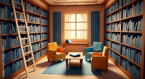 library, bookshelf, book, chair, interior, room, reading, study, wooden, light, sunlight, calm, warm, design, colours, furniture, table, ladder, cosy, interior design, education, cognition, digital, illustration, home, comfortable, style, visual, graphic, home decor, color palette, lighting, image, modern, quiet